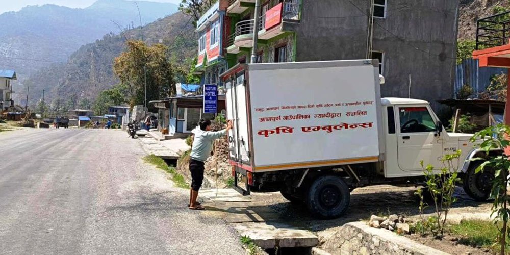 म्याग्दी । म्याग्दीको अन्नपूर्ण गाउँपालिकाले खरिद गरेको कृषि एम्बुलेन्स प्रयोगविहीन भएको छ । गाउँगाउँमा किसानले उत्पादन गरेको कृषि उपजलाई बजारसम्म पुर्‍याउन गाउँपालिकाले गत आर्थिक वर्षमा सङ्घीय सरकार र गाउँपालिकाको लागत साझेदारीमा एम्बुलेन्स खरिद गरेको थियो ।