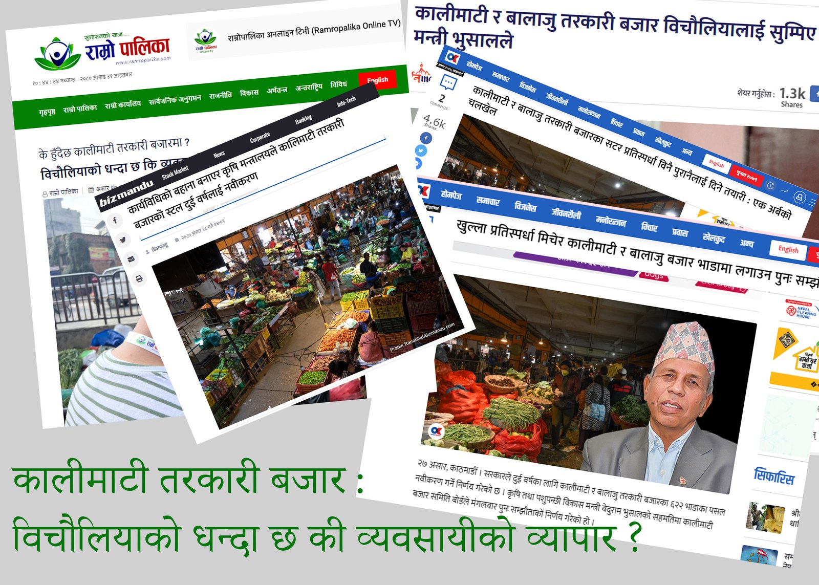 साउन एक गतेदेखि सरकारी स्वमित्वका कालीमाटी तथा बालाजुको फलफुल–तरकारी बजारको सटरहरू व्यवस्थित प्रणाली बनाएर किसान तथा उपभोक्ता मैत्री बनाई भाडामा लगाउनुपर्नेमा पुरानालाई सिधै नवीकरण गरिदिने प्रयास तिव्र भएको अवस्थामा समयावधि सकिन एक हप्तामात्र समय बाँकी रहँदा कालीमाटी फलफूल तथा तरकारी बजार विकास समितिले नयाँ प्रतिस्पर्धाको तयारी नै गरेको थिएन समितका सहयाक कार्यकारी निर्देशक अर्जुन प्रसाद अर्याल र प्रवक्ता एवं उपनिर्देशक विनय श्रेष्ठले राम्रोपालिका टिम संगको कुराकानीको क्रममा कालीमाटी र बालाजु बजारमा हालका व्यापारीको म्याद सकिएको र अब के गर्ने भन्नेबारे छलफल भइरहेको बताएका थिए ।