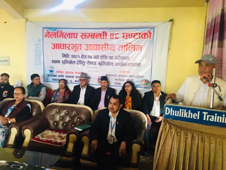 नगरपालिकाको न्यायीक समितिको आयोजनामा गत बिहिबारदेखी धुलिखेलको एक होटलमा आवशीय तालिम सुरु भएको थियो । आठ दिनसम्म चलेको उक्त (४८ घण्टे) तालिम मंगलबार सम्पन्न भएको हो ।