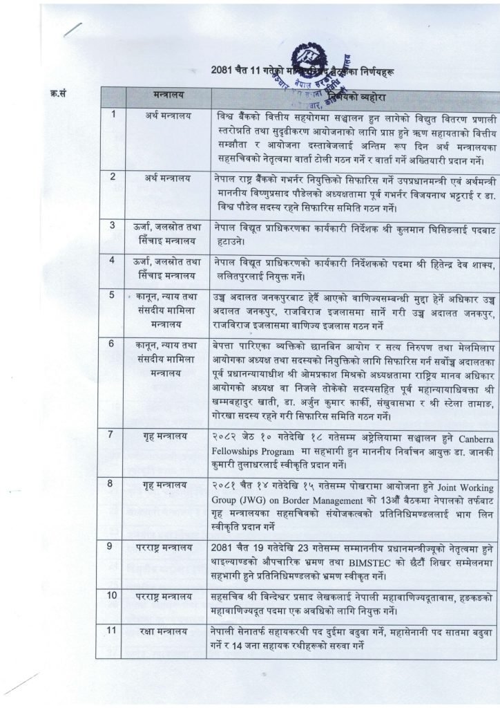 कुलामान बर्खास्तिदेखि गर्भनर नियुक्ति समितिसहित यी हुन् मन्त्रिपरिषद्का २७ निर्णयहरु