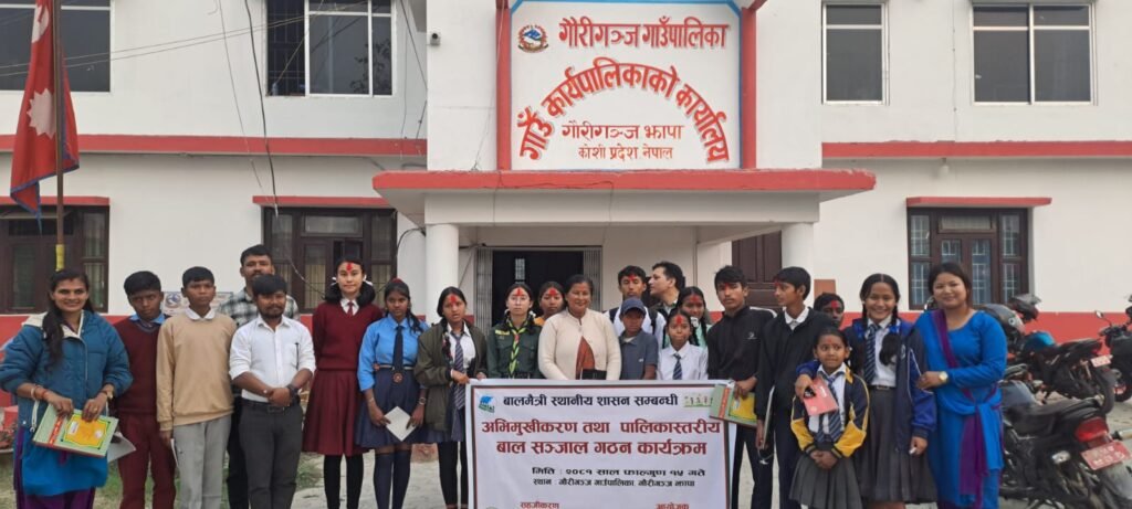 झापा। पौष मसान्तसम्म बालमैत्री पालिका घोषणा गर्न झापाको गौरीगञ्ज गाउँपालिका लागिपरेको छ । पालिकाभित्रका सम्पूर्ण विद्यालयमा बालक्लब र ६ वटै वडामा बाल सञ्जाल गठन गरिसकेर पालिकास्तरीय बाल सञ्जालसमेत गठन भइसकेपछि अब बालमैत्री पालिका घोषणा गर्ने आधार तयार भएको हो । गौरीगञ्ज पालिकाको सभाहलमा भएको भेलाले याज्या श्रेष्ठको अध्यक्षतामा पालिकास्तरीय बाल सञ्जाल गठन गरेको हो । जसको उपाध्यक्षमा ज्ञानदेव राजवंशी , सचिव केन्जल कुँवर ,सह–सचिव जेम्स सोरेन ,कोषाध्यक्ष शान्ता राजवंशी तथा सदस्यहरुमा धनुषा गोस्वामी, विकेनकुमार गनगाई , जेम्स सोरेन , समीक्षा ताजपुरीया र प्रतिमा ताजपुरीया रहेका छन् । पालिकास्तरीय बाल सञ्जालको संरक्षकमा गाउँपालिका अध्यक्ष फूलवती राजवंशी रहेकी छन् ।