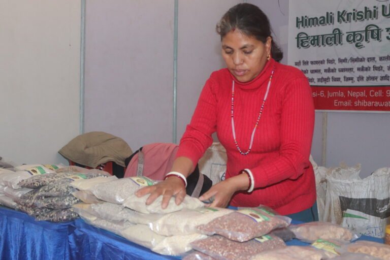 झापा । जुम्लाकी गंगादेवी राउत यतिबेला आफ्नै खेतीमा उत्पादित अग्यार्निक खाद्य सामग्री लिएर बिर्तामोड आइपुगेकी छिन् । आफ्नै उपार्जन र जिल्लावासीले उत्पादन गरेका कोदो, फापर , मकै , जौं, गहुँको पिठो र मार्सी धानको चामल लिएर उनी बिर्तामोड अन्तराष्ट्रिय व्यापार महोत्सवको स्टलमा बसेकी छिन् । त्यस बाहेक जडिबुटीको चिया, जिम्मु र दाँते ओखरपनि उनको स्टलमा रहेको छ ।