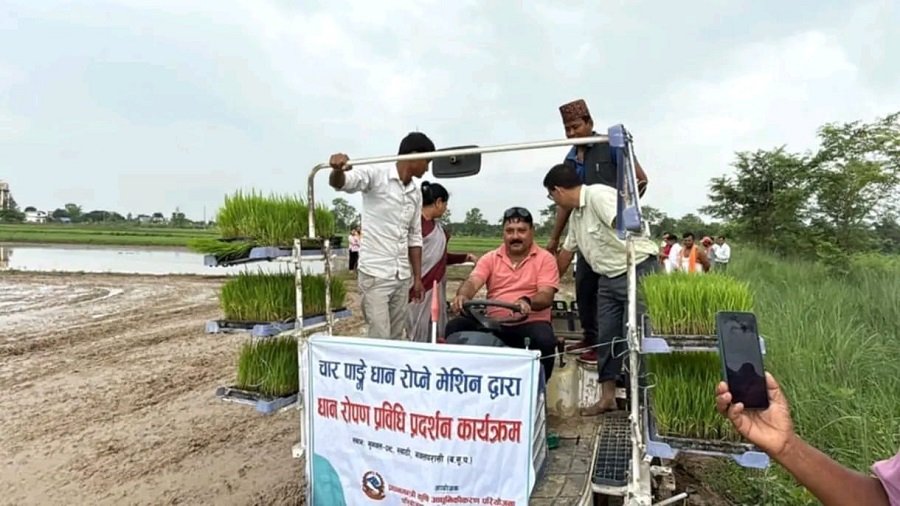 नवलपरासी पश्चिम । परम्परागत रुपमा हातले रोप्दै आएका नवलपरासी पश्चिमका किसानलाई मेसिनद्वारा धान रोप्न सिकाउन धान रोप्ने प्रविधिको प्रदर्शन गरिएको छ ।