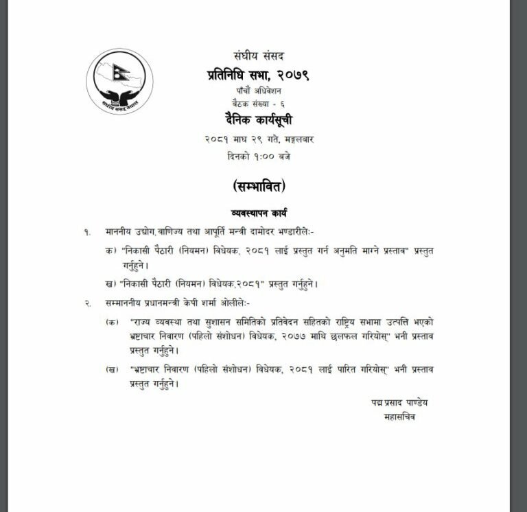 संघीय संसद सचिवालयले सार्बजनिक गरेको सम्भावित कार्यसुची अनुसार आजको बैठकमा उधोग, बाणिज्य तथा आपुर्ति मन्त्री दामोदर भण्डारीले ‘निकासी पैठारी (नियमन) बिधेयक, २०८१ लाइ प्रस्तुत गर्न अनुमति माग्ने तथा प्रस्ताव प्रस्तुत गर्ने भएका छन ।