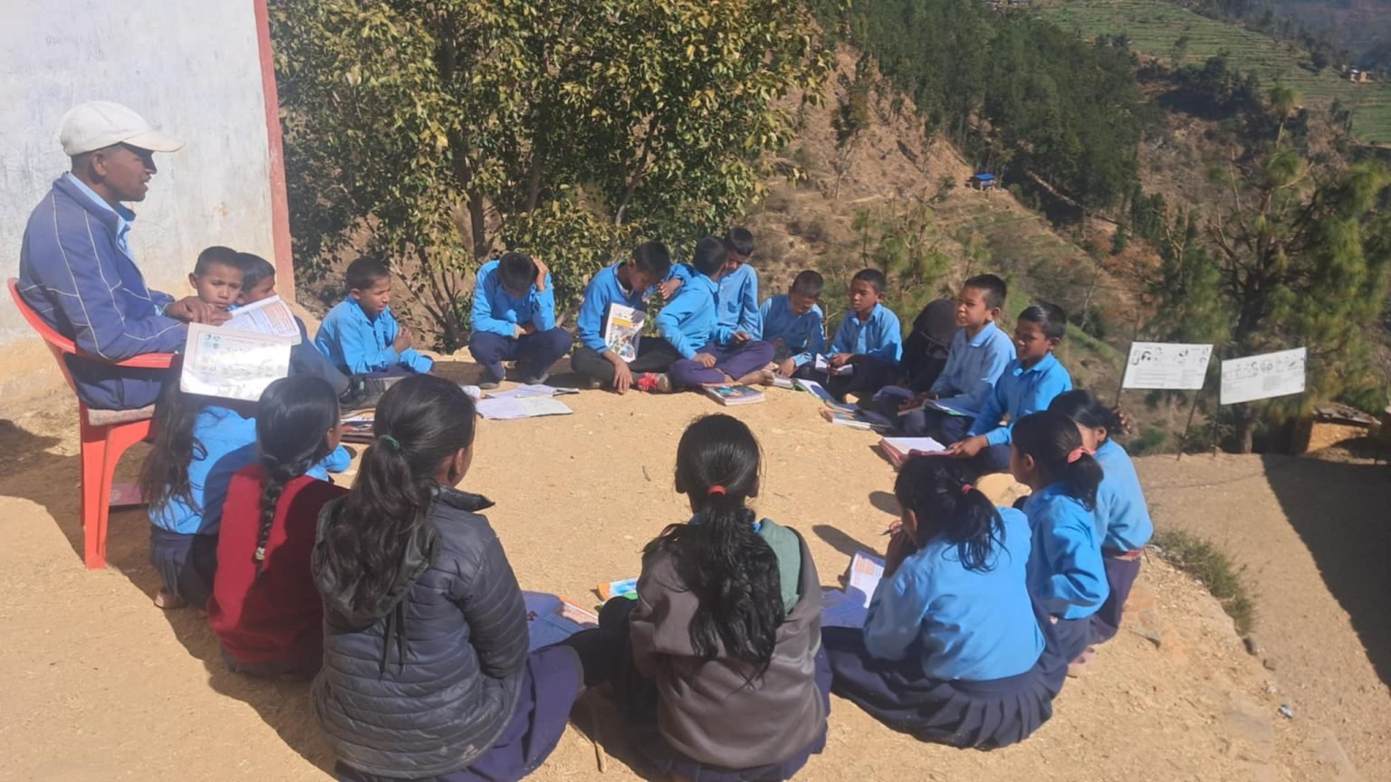 कक्षाकोठा अभावमा चौरमा पठनपाठन गर्न बाध्य बालबालिकाहरू । गोरखापत्र ।