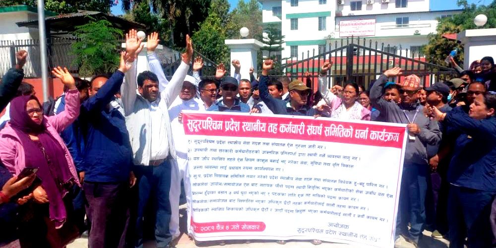 स्थानीय तहका कर्मचारीले दिए मुख्यमन्त्री तथा मन्त्रीपरिषद् कार्यालयमा धर्ना