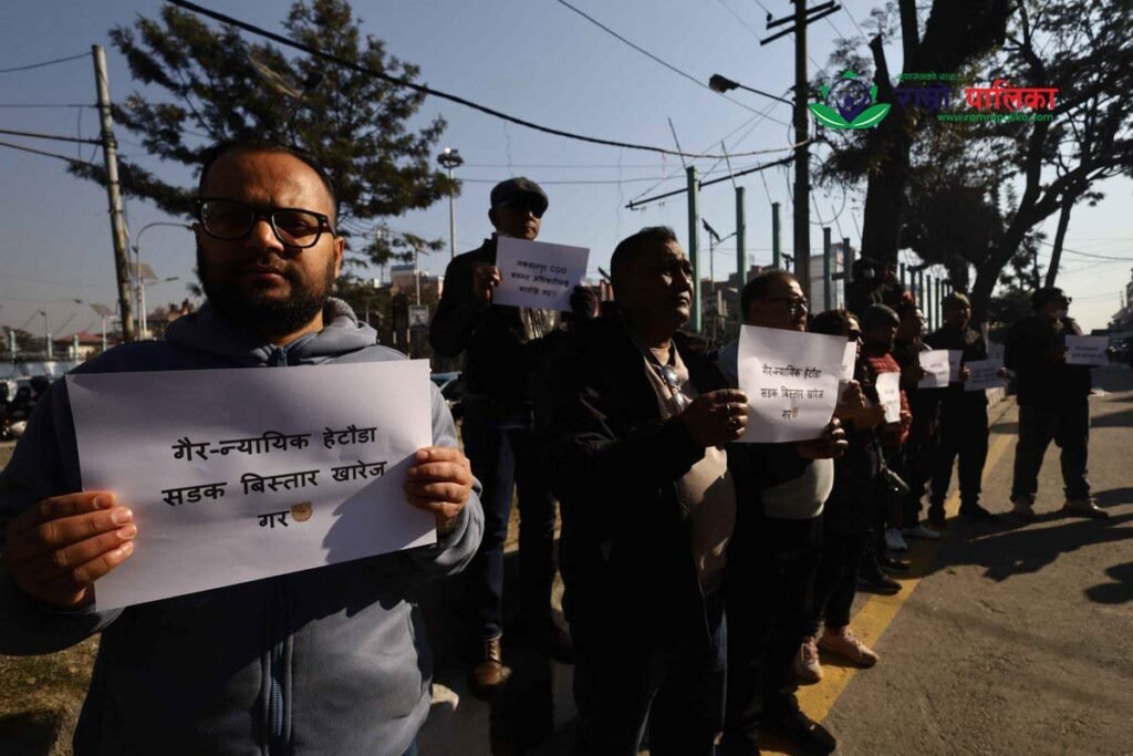 काठमाडौँ । हेटौँडा सडक विस्तारका पीडितहरूले माइतीघरमा बाजा सहित विरोध प्रदर्शन गरेका छन् ।