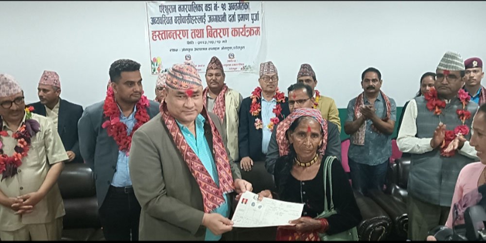 २०५५ सालमा डडेल्धुराको परशुराम १२ को तत्कालीन सुकुम्बासी समस्या समाधान आयोगले नापजाँच गरी जग्गा धनी दर्ता पुर्जा दिइसकेको थियो । तर दर्ताले बैधता नपाएकाले पुनः दर्ता प्रक्रिया सुरु गरि सोमबार स्थानीयहरु लाई पुर्जा वितरण गरिएको छ ।