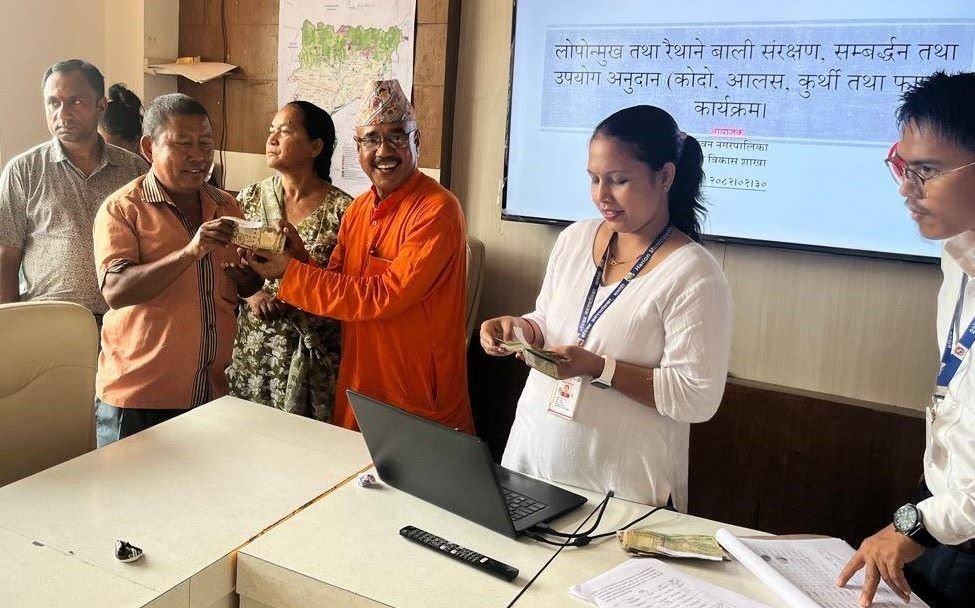 यो वर्ष नगरको कार्यविधि पूरा गरेका ३८ जना किसानले उत्पादन गरेको ८६.६७ क्विन्टल कोदो र १२.५ क्विन्टल कुर्थीको अनुदान रकम प्रदान गरिएको हो । कोदो र कुुर्थी फलाउने किसानलाई नगरपालिका कार्यालयमै बोलाएर नगर प्रमुख रमेश बुुढाथोकी (कमल), उपप्रमुख हरिमाया घलान र प्रमुख प्रशासकीय अधिकृत हेमराज फुँयालले अनुदान रकम हस्तान्तरण गर्नुभएको छ ।