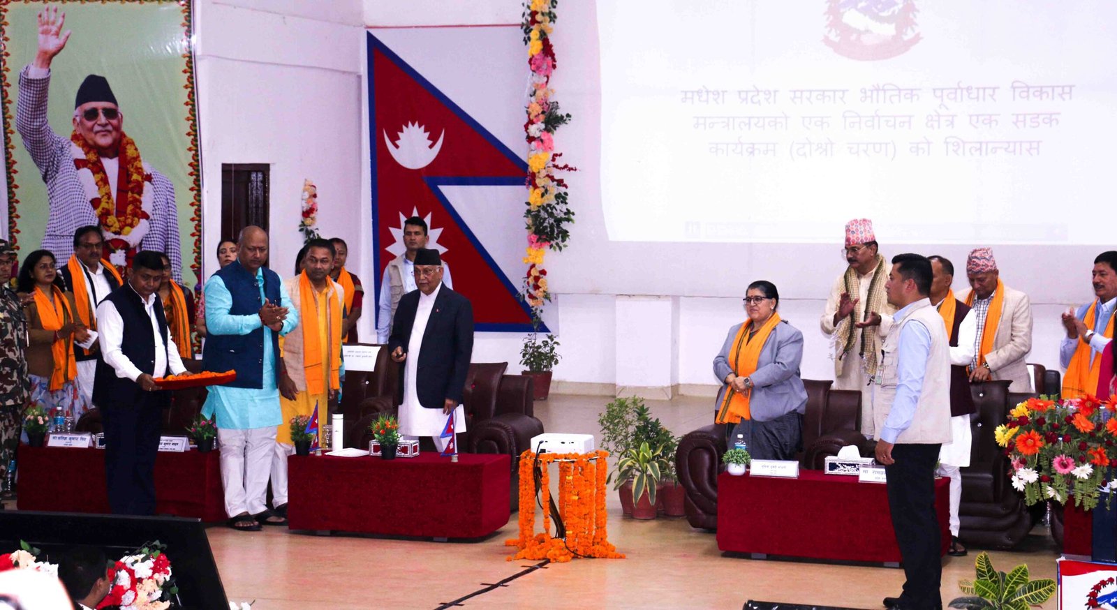 जनकपुरधाम। प्रधानमन्त्री केपी शर्मा ओलीले मधेश प्रदेश सरकारको ‘एक निर्वाचन क्षेत्रः एक सडक’ नामक गौरवपूर्ण योजनाअन्तर्गत निर्माण हुने ६४ वटा सडक आयोजनाको प्रधानमन्त्री केपी शर्मा ओलीले एकैपटक विद्युतीय माध्यममार्फत शिलान्यास गर्नुभयो ।