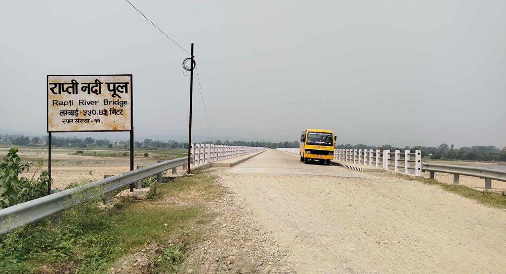 देउखुरी । दाङको राजपुर गाउँपालिका–१, बेलाका अजय यादव दुध बिक्री गर्न पौडेर राप्ती नदीवारि लमही आउनुहुन्थ्यो । नदीमा भेल आएको समयमा दुध बिक्री गर्न बजार आउन सम्भव नै थिएन । कति पटक उहाँले दुधले भरिएका भाँडा नै नदीमा बगेको स्मरण गर्नुहुन्छ । उहाँ भन्नुहुन्छ, “पुल नहुँदा राप्तीपारि (लमही बजार क्षेत्र) मा जान हैरानै थियो, भेलमा दुधले भरिएका ग्यालेन नै नदीले बगाएर घर फर्केको छु, पुल बनेपछि पहिलेको सबै कष्ट बिर्साएको छ ।”